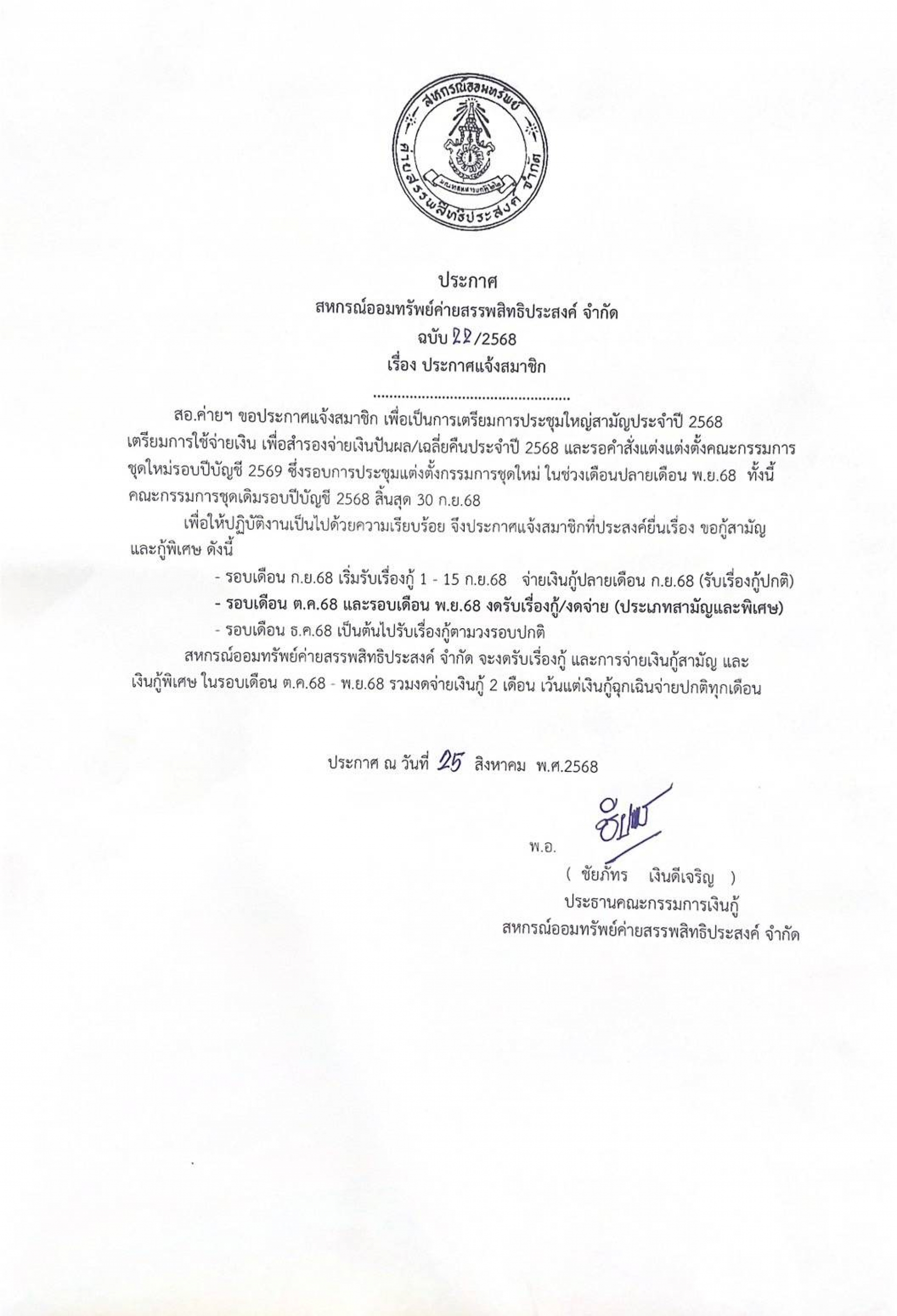 วันที่ 21 พ.ย.67 เวลา 09.00 น. สหกรณ์ออมทรัพย์ค่ายสรรพสิทธิประสงค์ จำกัด ได้จัดการประชุมใหญ่สามัญประจำปี 2567 ณ หอประชุมเทศบาแสนสุข โรงเรียนเทศบาลแ...