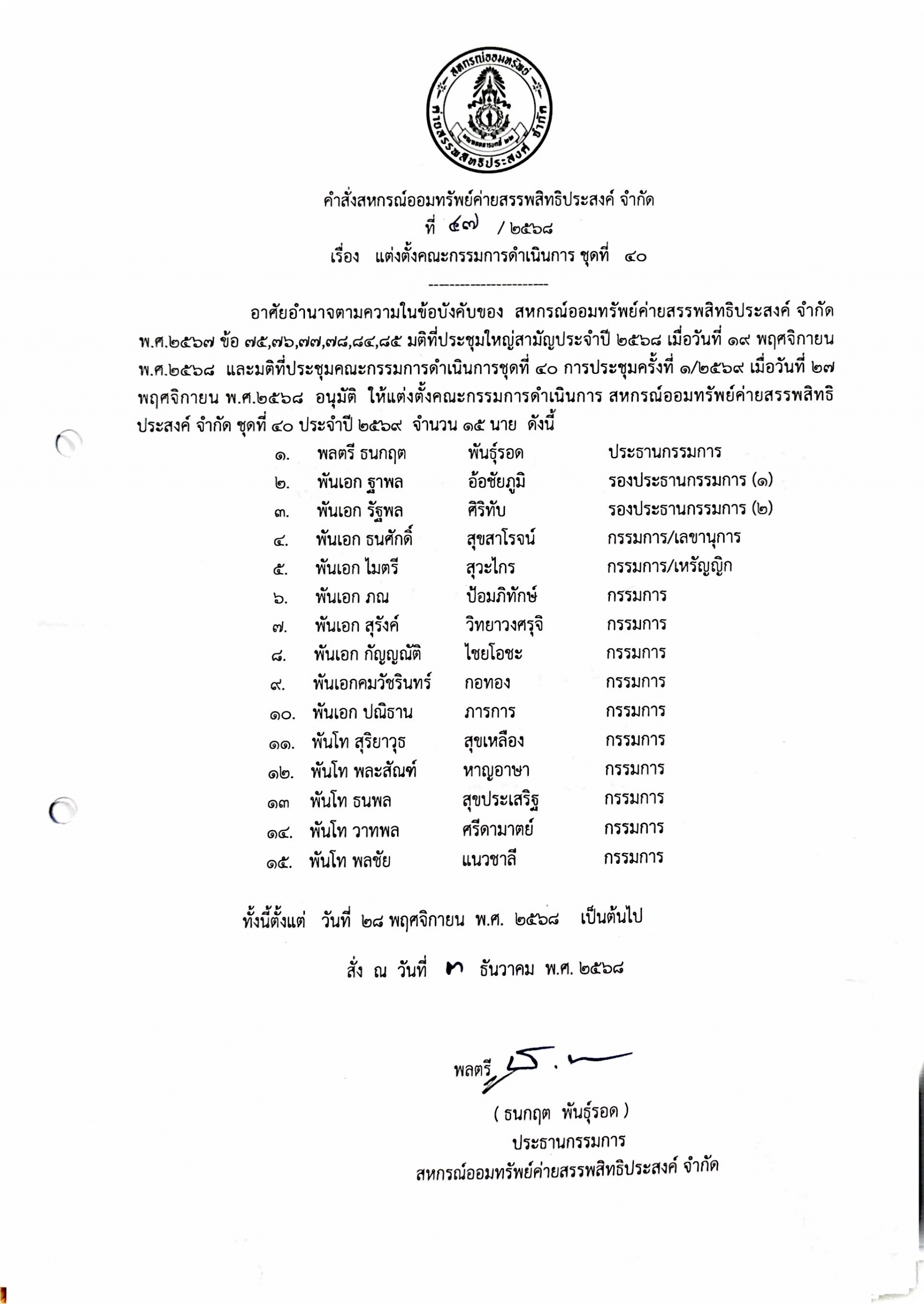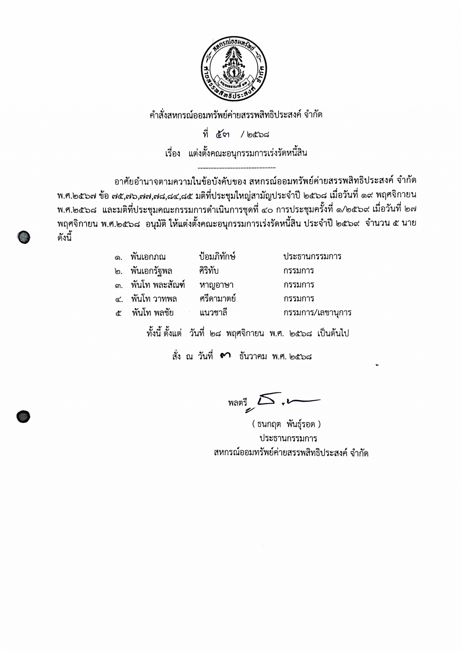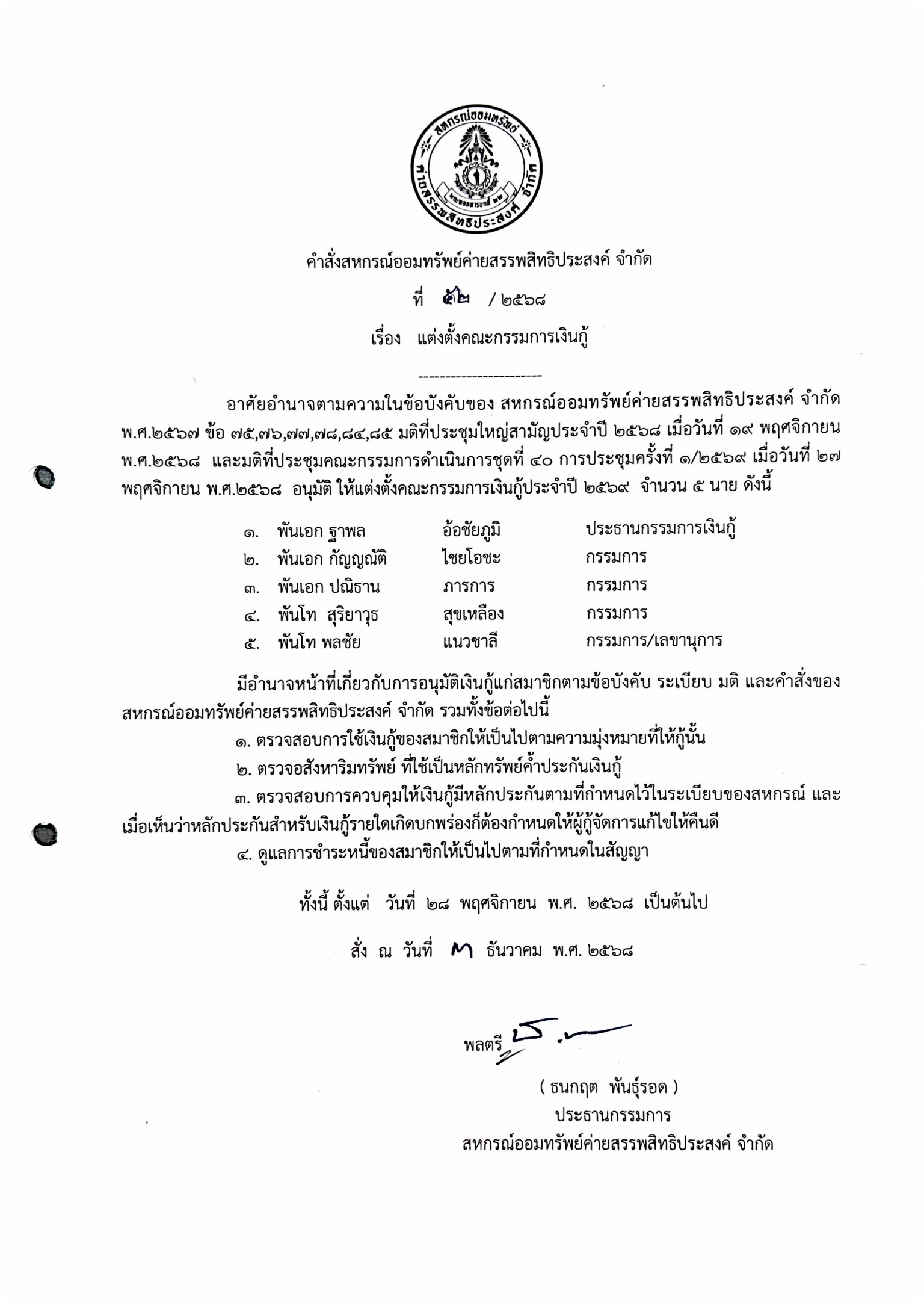 วันที่ 26 กุมภาพันธ์ 2568 เวลา 0630 น. สหกรณ์ออมทรัพย์ค่ายสรรพสิทธิประสงค์ จำกัด นำโดย พลโท ดร.ยงยุทธ สอนไม้ ที่ปรึกษาฝ่ายวิชาการ กรรมการ เหรัญญิก ...